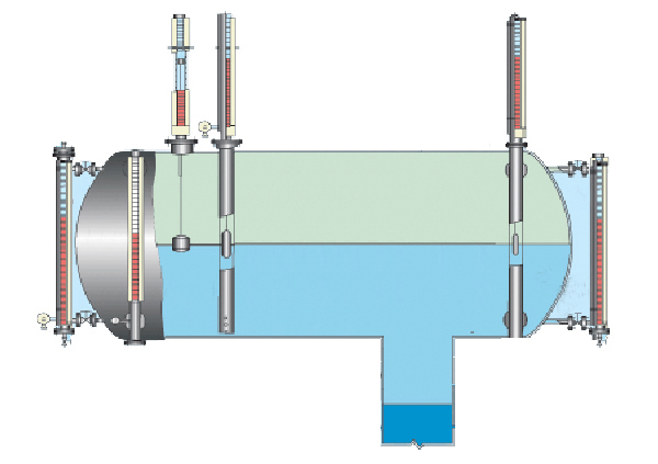 帶伴熱式磁浮子液位計(jì)根據(jù)浮力原理和磁性耦合作用原理工作的。當(dāng)被測(cè)容器中的液位升降時(shí),液位計(jì)主導(dǎo)管中的浮子也隨之升降,浮子內(nèi)的磁鋼通過磁耦合傳遞到現(xiàn)場(chǎng)指示器,驅(qū)動(dòng)紅白翻柱轉(zhuǎn)180°,當(dāng)液位上升時(shí),翻柱由白色轉(zhuǎn)為紅色,當(dāng)液位下降時(shí)翻柱由紅色轉(zhuǎn)為白色,指示器的紅、白界位處為容器內(nèi)介質(zhì)液位的實(shí)際高度,從而實(shí)現(xiàn)液位的指示。